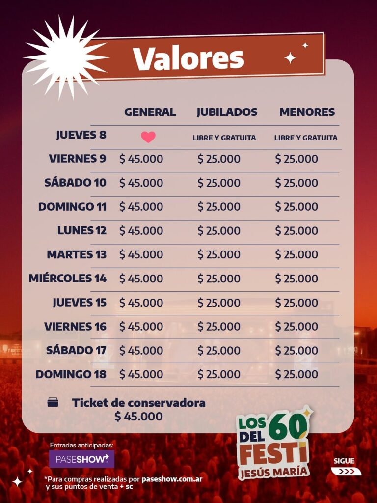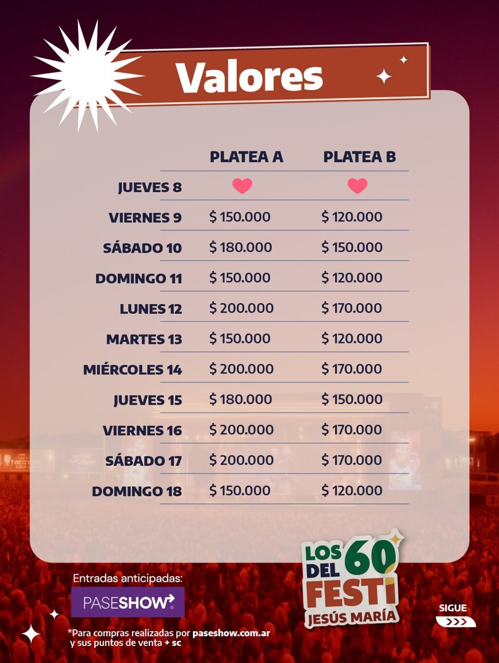 Desde la pagina oficial del festival se dieron a conocer los precios de las entradas noche por noche